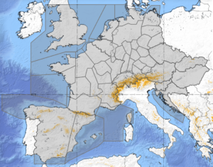The benchmark base dataset is a low-resolution gridded dataset that covers the European area from 36 to 67° in latitude and from -6 to 17° of longitude, with grid spacing of 0.25°x0.25°.
